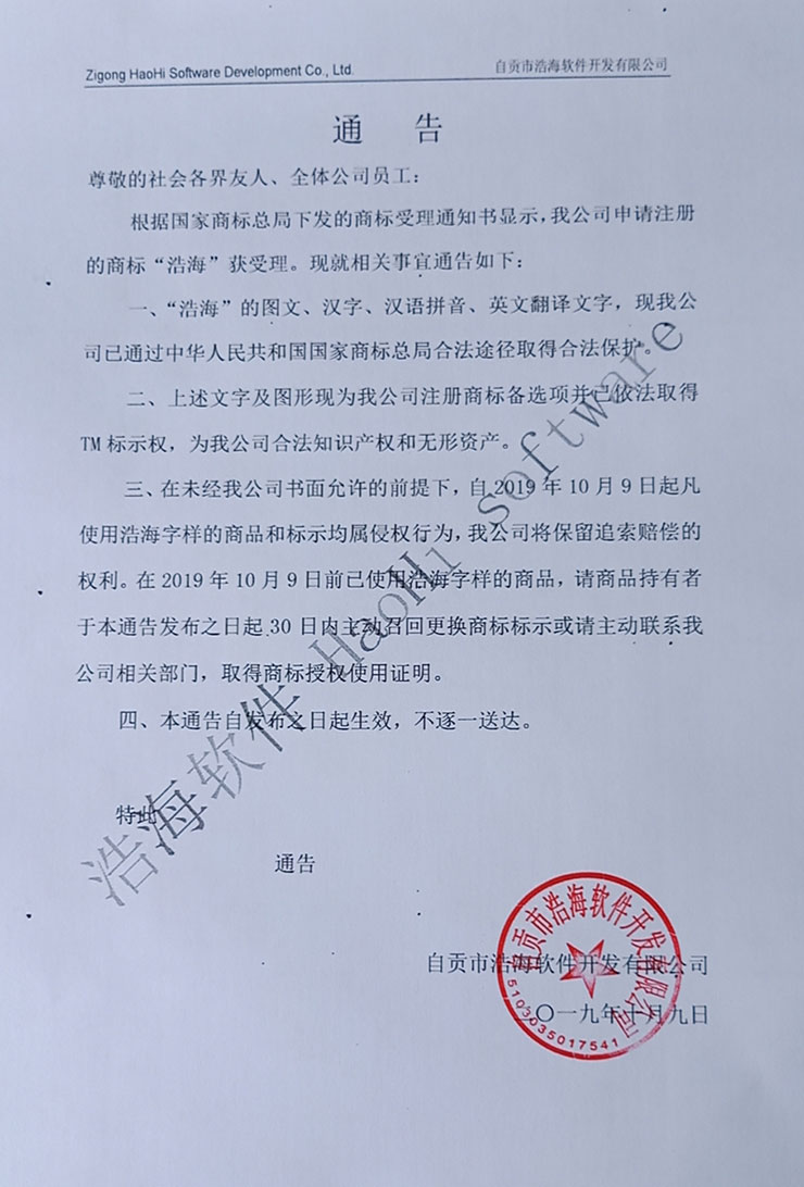 關(guān)于我公司“浩!鄙虡(biāo)使用的通告
